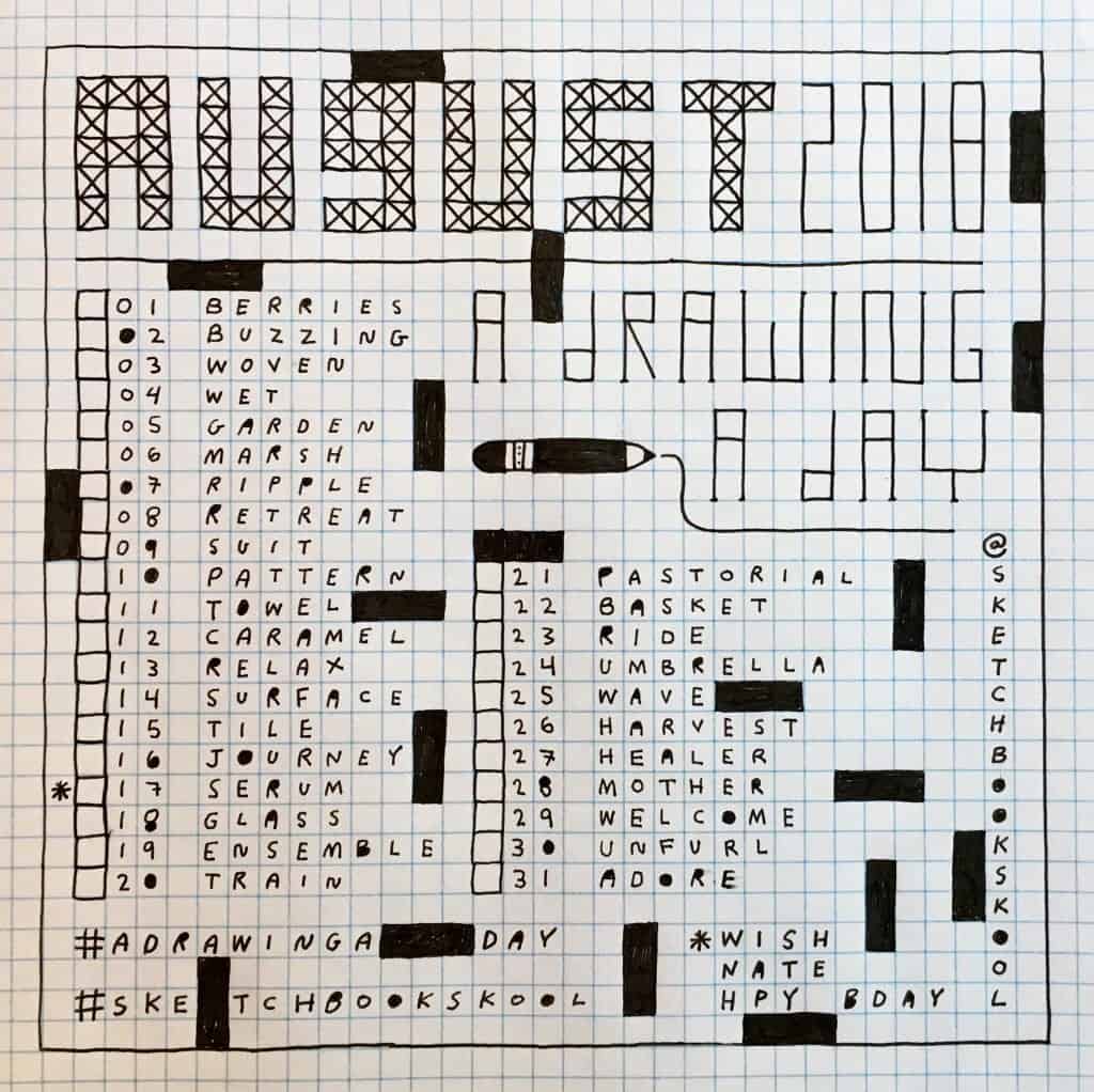 Here are your August prompts for A Drawing A Day, hand lettered by Nate Padavick!