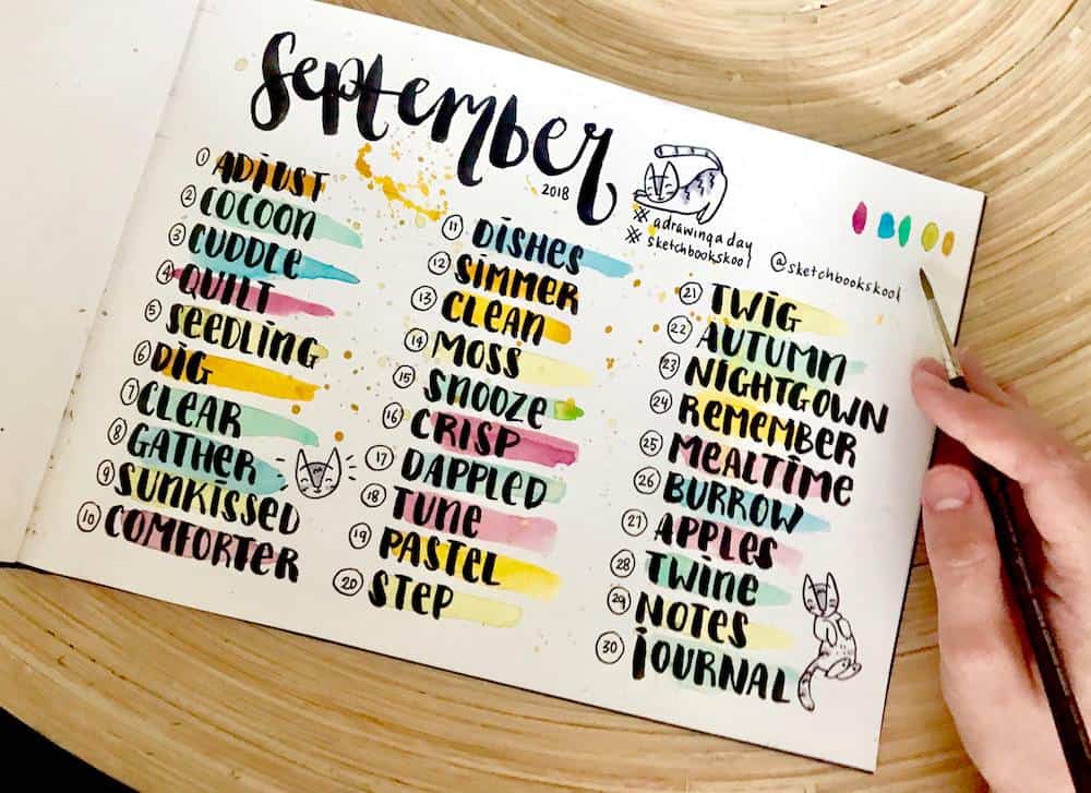 Here are your September prompts for A Drawing A Day, hand lettered by Anna Denise Floor!